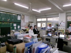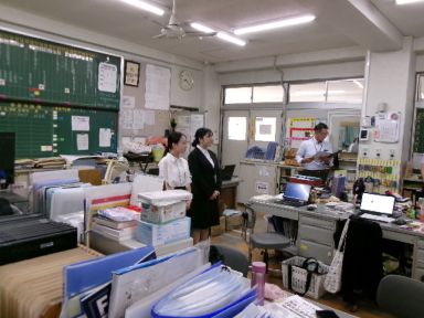 職員室で校長先生からの紹介の後、先生たちにあいさつをしてもらいました。教職に対する熱い思いが伝わってきました。3週間の間、土生っ子たちとたくさん関わってもらい、たくさん思い出を作ってもらいながら教職の技術を身につけていってほしいと思います!