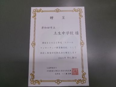 今年度、土生中学校は日本教育公務員弘済会様より「スクールフォローアップ事業推進校」に認定していただきました。
