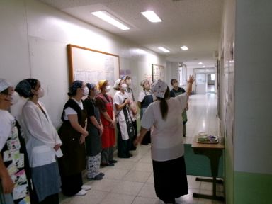 子どもたちと同じように給食の準備も体験していただきました。配膳室に食缶を取りに行き・・・
