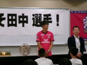 サッカー部員が田中選手を迎えます。ドキドキしながら待っていると・・・